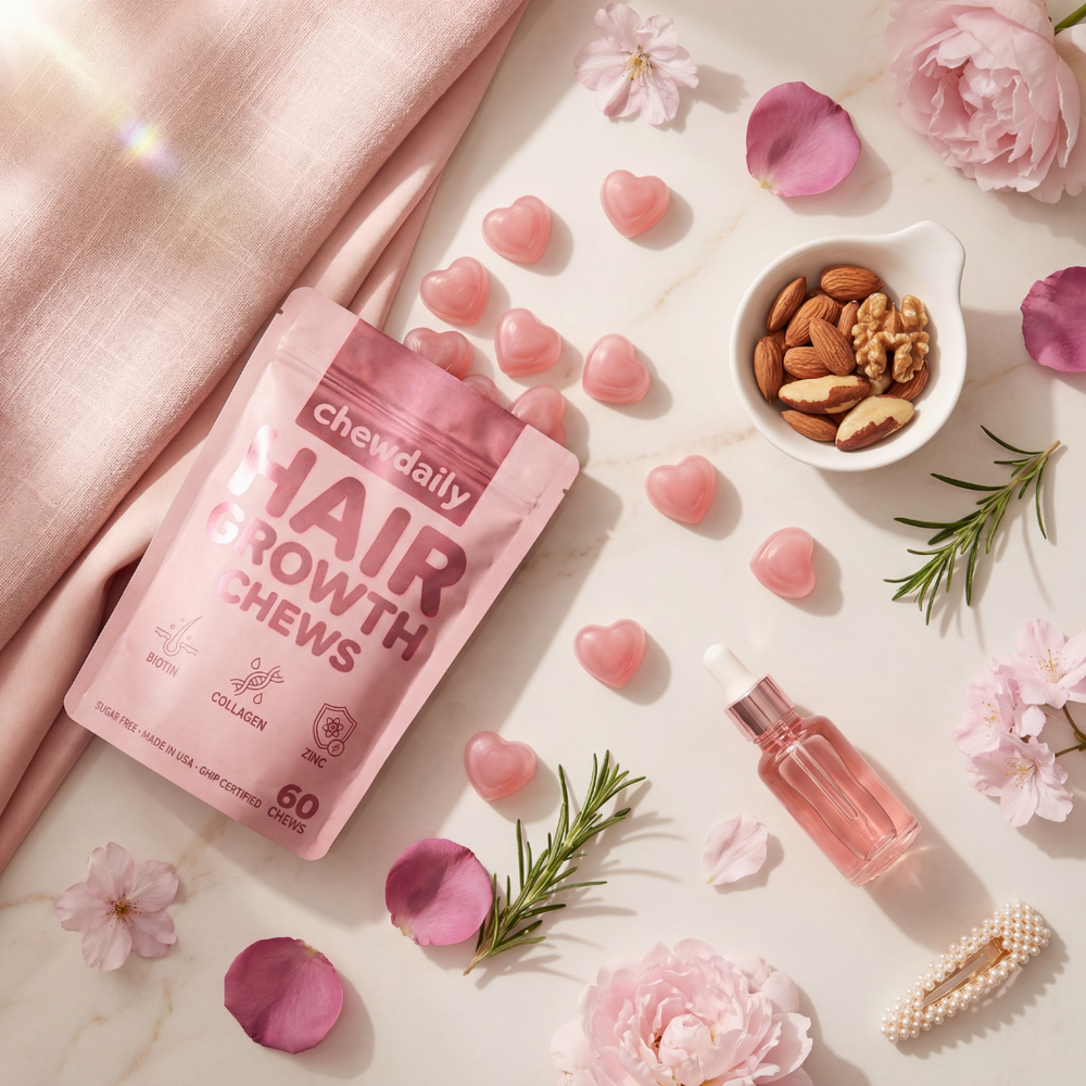"My hair is visibly thicker, grows so much faster, and the shine is unreal. Plus it actually tastes delicious — like a treat, not a chore. Love chewdaily Hair Growth Chews."